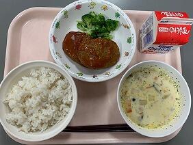 麦ごはん 添えブロッコリー トマトソースハンバーグ コーンスープ