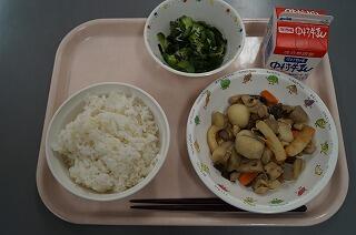 麦ごはん 鶏肉のうま煮 きゅうりとわかめの酢の物