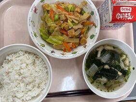 みそ炒めは、ミニ厚揚げがたっぷり入っていました。大きいものより味が染みやすく、食べるとじゅわっとみその味が口の中に広がります。キャベツやたけのこの食感も楽しめました。白玉団子汁は具だくさんで食べ応えがあり、醤油風味の出汁でご飯がすすみました。白玉がもちもちしていて子どもたちも嬉しそうに食べていました。
