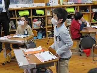 国語の時間に書いた、おもちゃの作り方の作文を発表する2年生。おもちゃの遊び方の実演もしました。