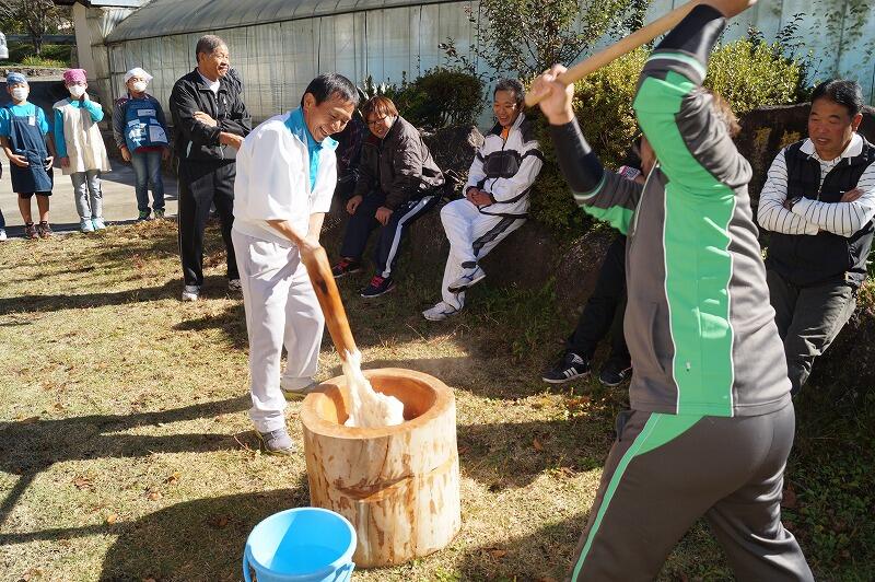 みんなで餅をつきながら、つき方のご指導、炊き方のご指導をいただきました。