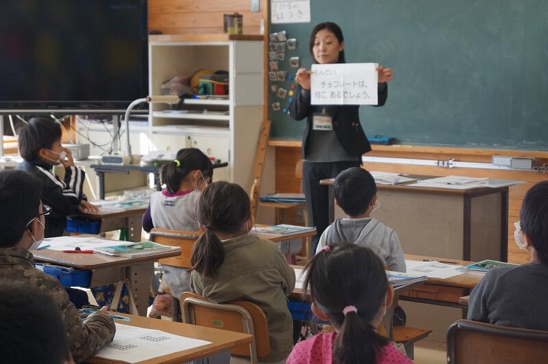 大河内小学校児童は7名で、各学年の授業に参加します。普段1~3名の学級で授業を受けているので、30名ほどの学級での授業経験はとても貴重です。