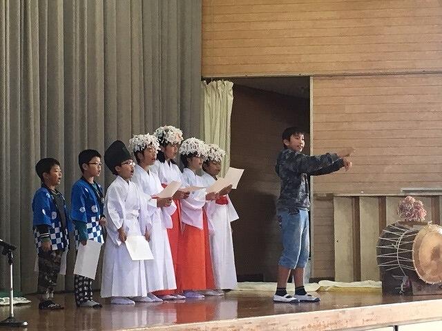 祭りの中のやまびこ発表会では、毎年、各小学校校区の子供会が、ステージで伝統芸能の披露を行います。今年も、大河内子供会は神楽の「みくま」を舞いました。神楽保存会のご指導の下、週一回の練習を熱心に取り組み、自信をもってステージで舞を披露することができました。