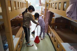 ベッドや部屋の片付けをして、そうじもします。来たときよりも美しく。