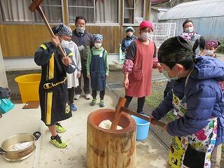 参観授業の後は、お待ちかねのもちつきです。朝からお家の人たちが様々な準備をしてくださいました。