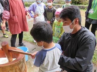 いよいよ子どもたち。もちではなく臼をついて、手がジーンとなる子も。それでもがんばります。