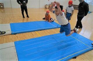 立ち幅跳び。踏み切りのタイミングが大切です。先生たちも挑戦します。春の1回目より記録は伸びたかな?