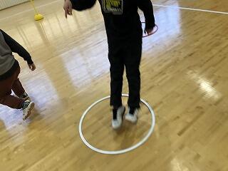 次は「しまとり(島取り)」。フープが「島」で、次々に島を乗り換えていく遊びだそうです。「同じ島に入ることはできません。」、「鬼が「しまとり!」と言ったら、別の島に行ってください。」。