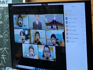 椎葉村5校の5・6年生と宮大附属小6年生3クラスが集まる全体会は、画面越しでも壮観でした。