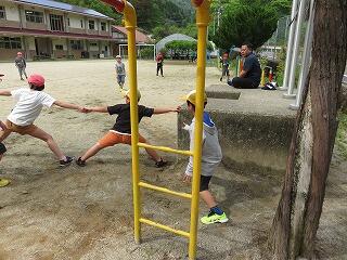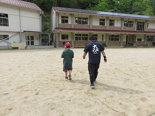そこに近付く1・2年生。上級生より早く授業が終わったので、先に運動場に出てきて遊んでいたのです。