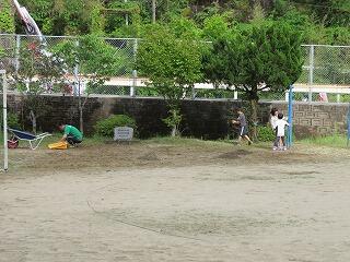放課後、校長先生が運動場の整備作業をしていました。トラック部分まで生えてきた草を抜いています。