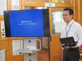 椎葉村教育委員会が「パソコンを使った授業のアドバイザー」をお願いしている、宮崎大学の小林博典先生に来ていただきました。今回は、5・6年生に「プログラミング教育」の授業をしていただきました。