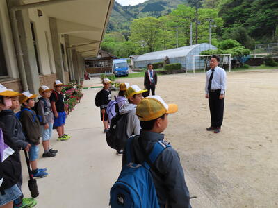 4月26日(金)は待ちに待った「春の遠足」でした。子どもたちに毎月行うアンケートにもこの行事を楽しみだと回答する子どもが多くいました。登校後、すぐに出発式を行い、校長先生から「たくさん楽しんできてください。」とお話をいただいたり、諸注意を聞いたりしました。みんなしっかりと話を聞いていました。