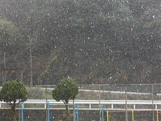 大粒の初雪が、舞っています。椎葉村内でも場所によっては、雨のところもあるようですが大河内小の周辺や峠付近は雪です。峠付近は、2㎝程度積もっているとのことです。お日様が出ていて、雪が降っているのは不思議な感じです。