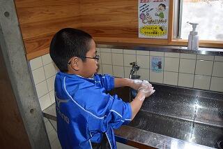 いよいよ今日メインの学校保健委員会です。九州保健福祉大学の佐藤圭創教授とお2人の学生さんから感染症予防について、主に「マスクの正しいつけ方」と「手の洗い方」について実際にマスクをつけたり手を洗ったりしました。ばい菌が全て落ちるまで、手洗いをしっかり頑張りました。