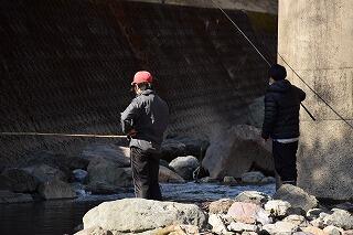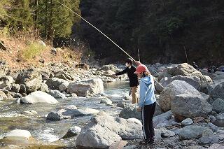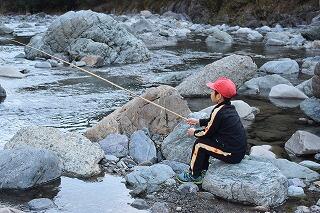 5日(木)のクラブ活動の時間に、みんなで学校下の渓流でヤマメつりをしました。
