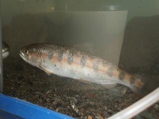 写真のヤマメは、先日つり上げたものを学校の水槽に3匹入れました。3匹とも元気に