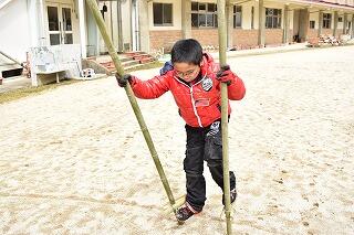 出来上がったらすぐに、竹馬乗りの練習です。はじめのうちは、なかなかうまく乗れな