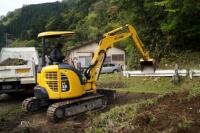 朝7時半より作業開始。学校横駐車場の一部の土地を、工作機械を使って掘り下げ、周囲には田んぼ用のゴム製ボードを設置し、ダンプカー4台分の土を入れました。排水のためのパイプも取り付け、水を入れながらトラクターで耕し、6M×6Mの田んぼが完成しました。終了したのは午後3時頃でした。