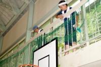 団長と副団長が、体育館内を走ったり、バスケットボールのフリースローをしたりして競い合った後選んだ風船を割ると、風船の中から色紙が出てきて、団の色が決まるというものでした。