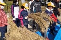 お昼からは、先日刈り取った「稲の脱穀」をしました。