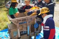 地域の方から「足踏み脱穀機」や「とうみ」をお借りして、昔ながらの脱穀を体験しました。