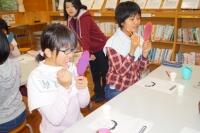 そして、保健の先生から、正しい歯みがきの仕方を教えていただいた後に、自分で手鏡を見ながらていねいにみがいて、歯垢を落としました。