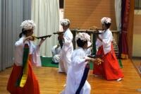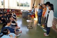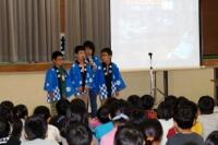 祝子さんたちの太鼓や笛にあわせ、5・6年生が舞います。鉦は3年生、お囃子は2・4年生が担当しました。