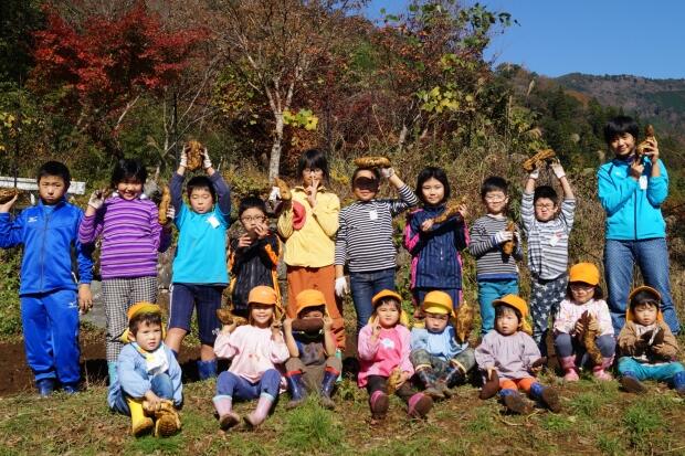 雲一つない青空の下、保育所生といっしょに楽しく芋掘りができました。