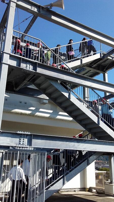 この小学校の屋上には津波のための避難施設があります。全員で見学をしました。