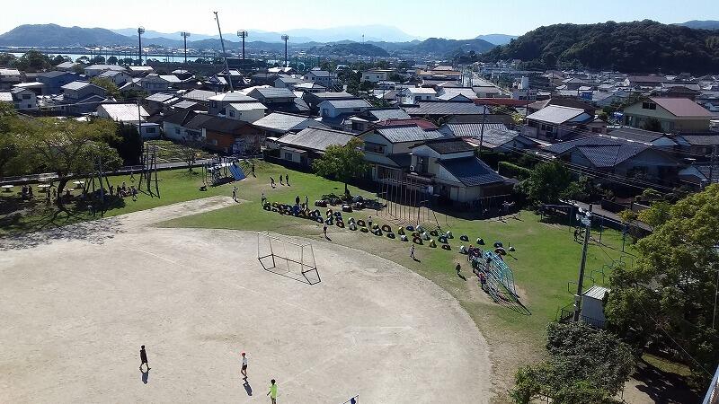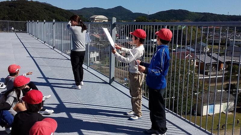草川小に着く前に、遠見山に登りました。高台にある展望台から見えたのは、