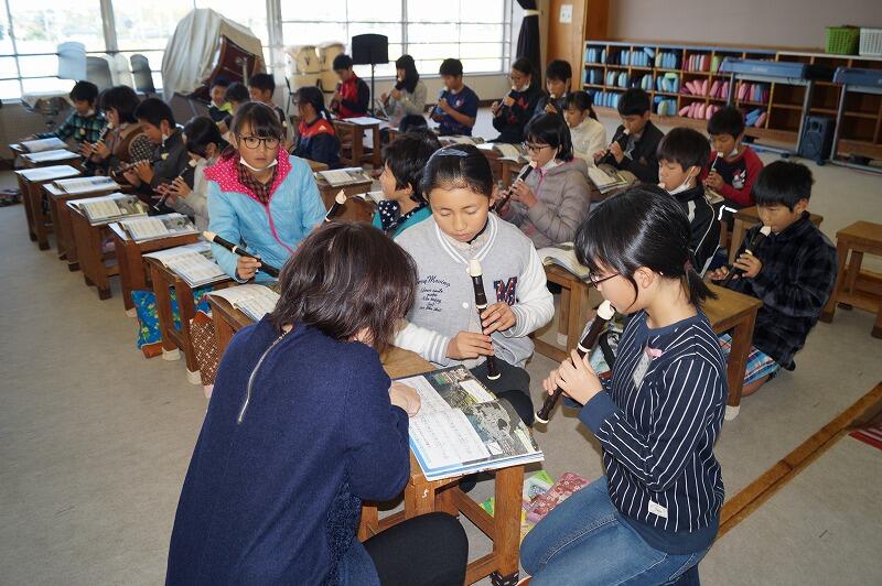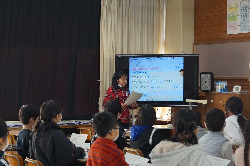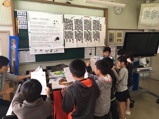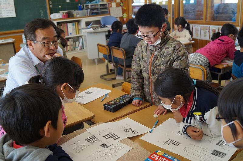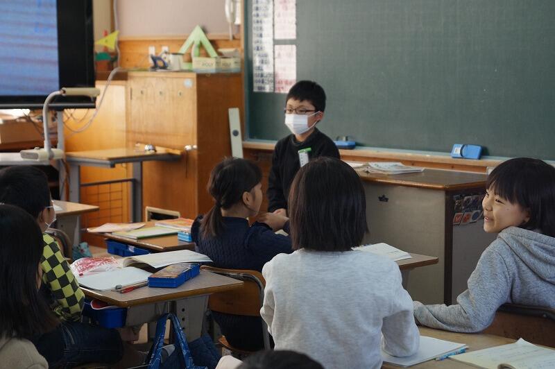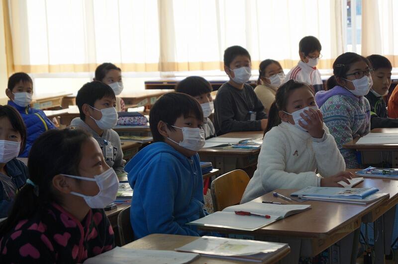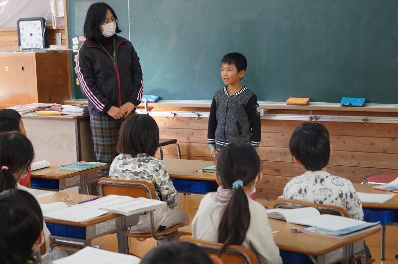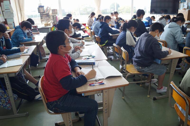 大河内小学校児童は7名で、各学年の授業に参加します。普段1~3名の学級で授業を受けているので、30名ほどの学級での授業経験はとても貴重です。