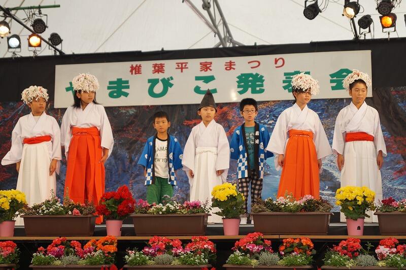 祭りの中のやまびこ発表会では、毎年、各小学校校区の子供会が、ステージで伝統芸能の披露を行います。今年も、大河内子供会は神楽の「みくま」を舞いました。神楽保存会のご指導の下、週一回の練習を熱心に取り組み、自信をもってステージで舞を披露することができました。