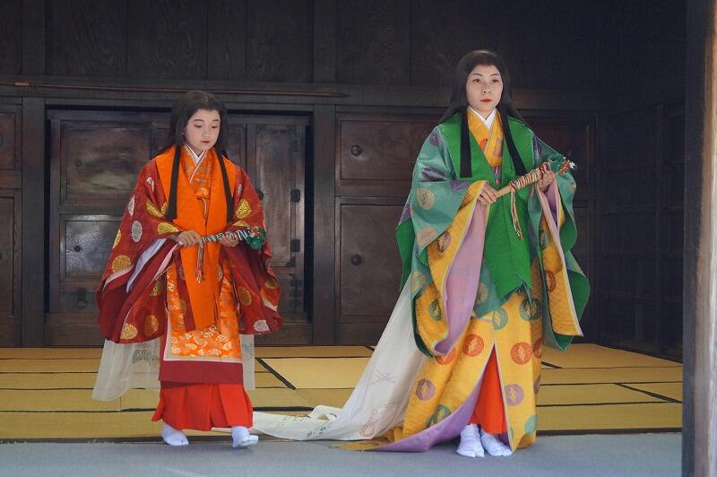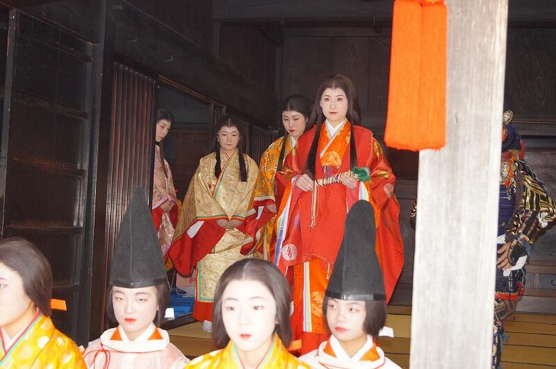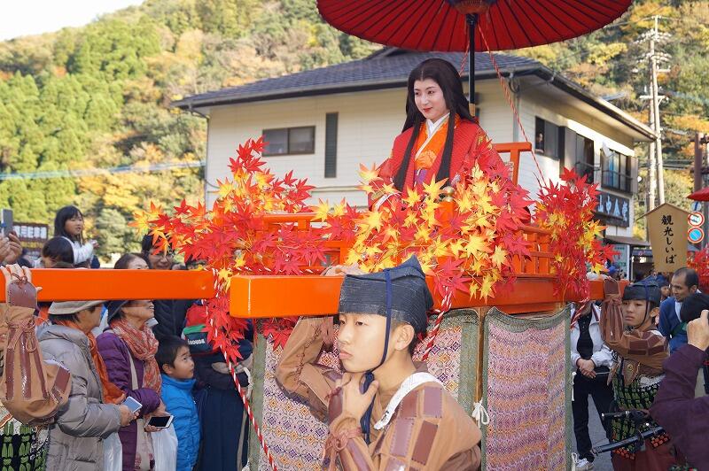 平家落人伝説の那須の大八郎と鶴富姫がともに導きあい鶴富屋敷から中央ステージまで一緒に進んでいきます。