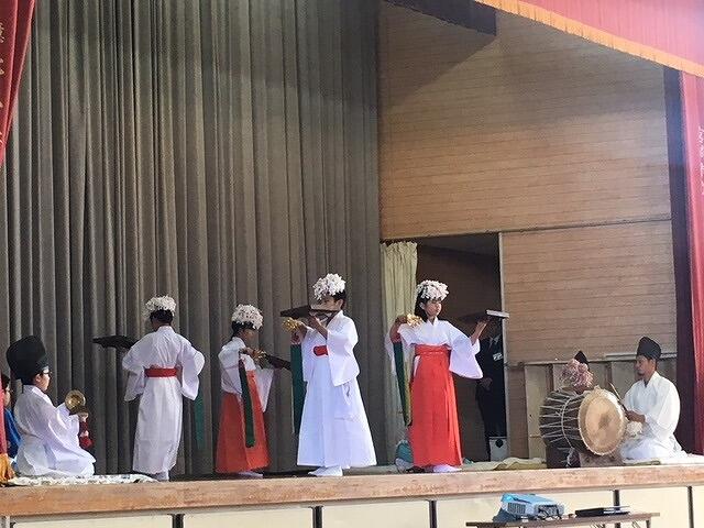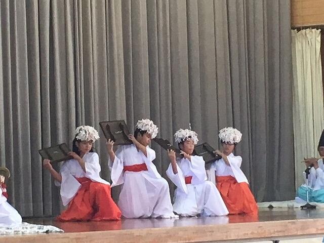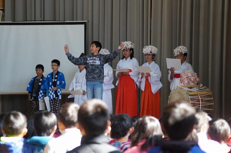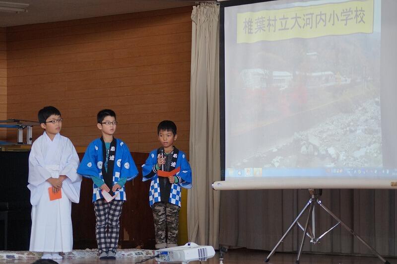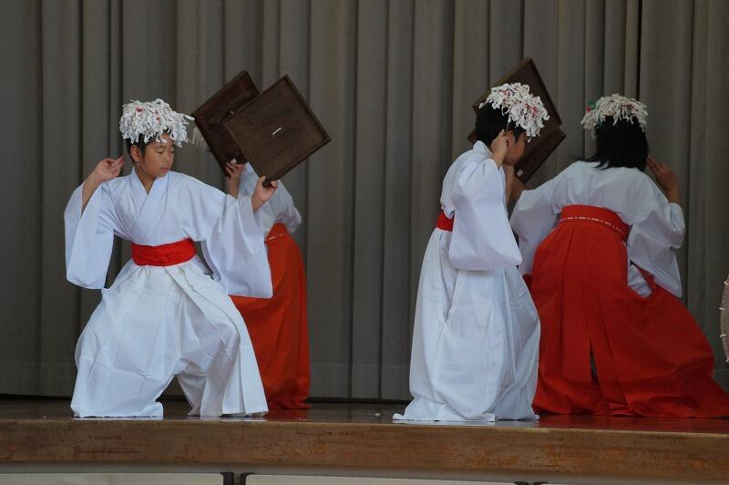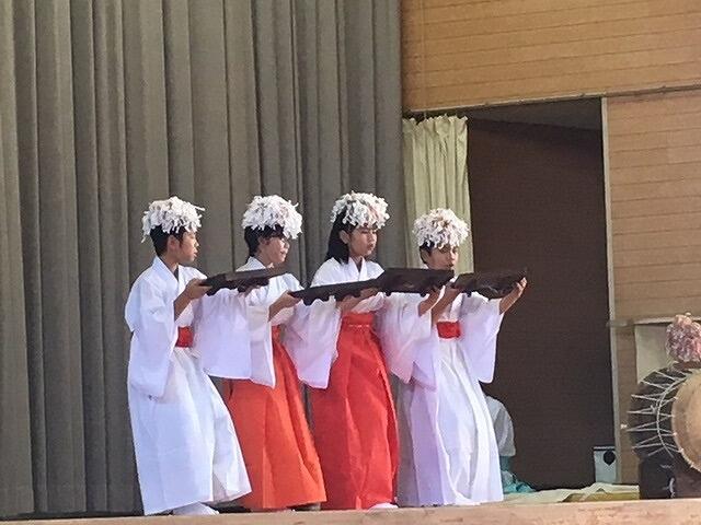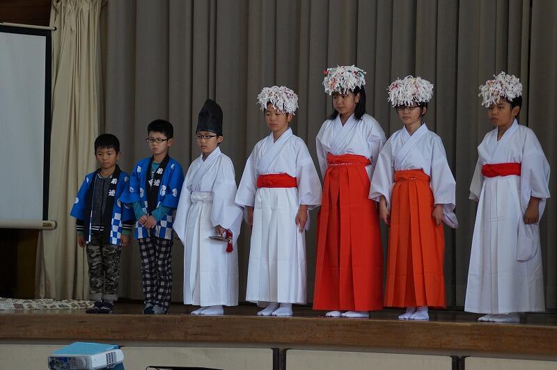 学校紹介の次には、椎葉村大河内の伝統的な神楽の舞を披露しました。