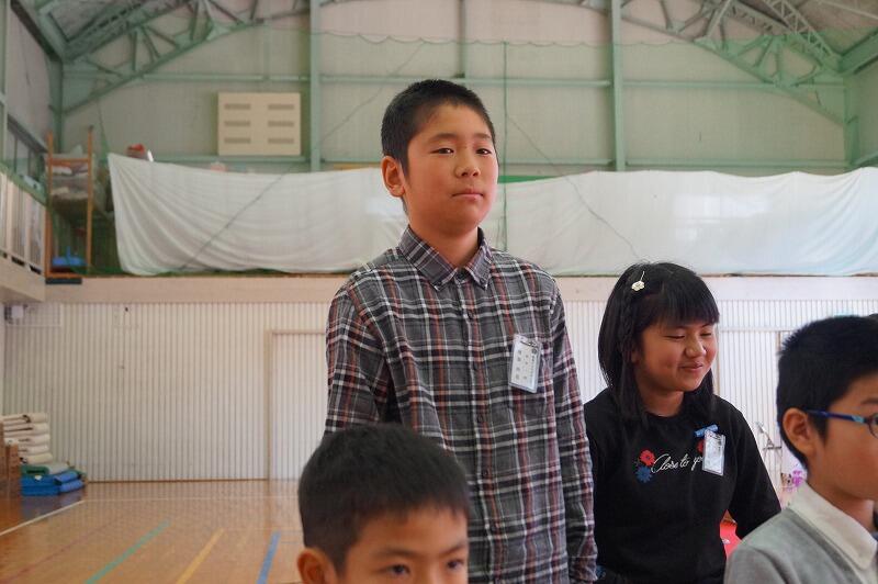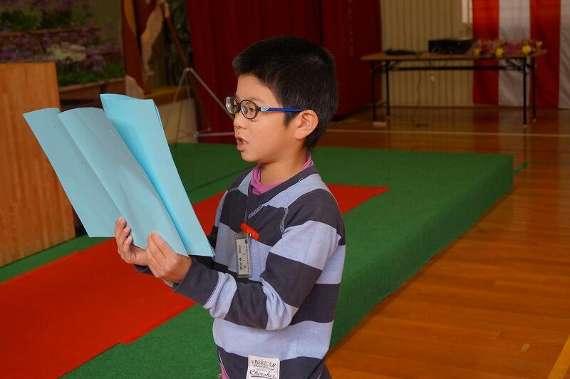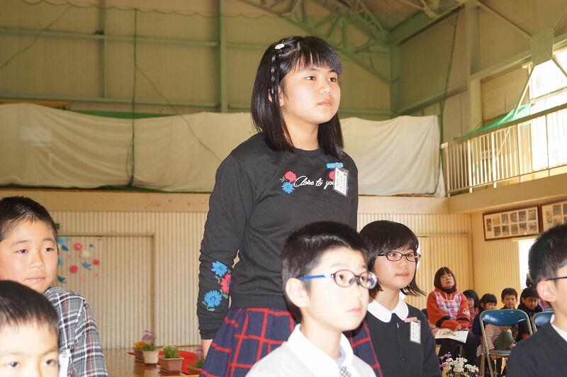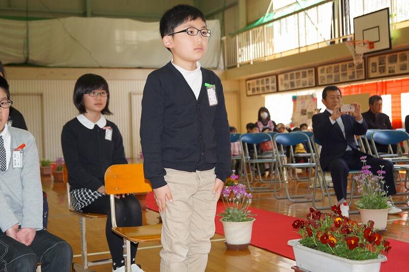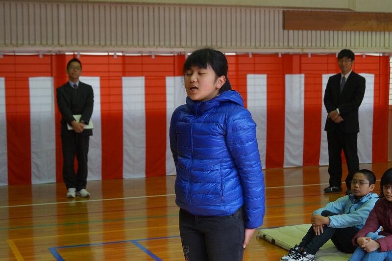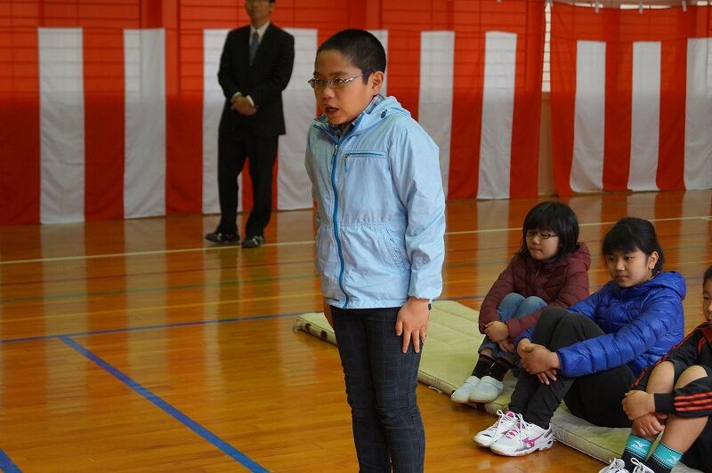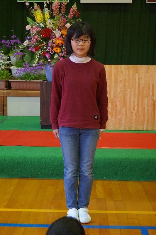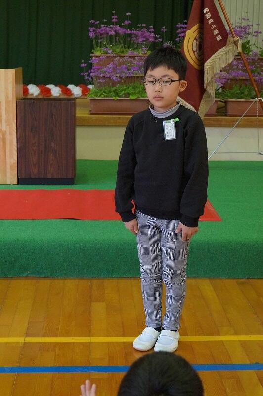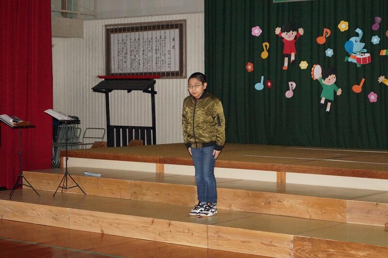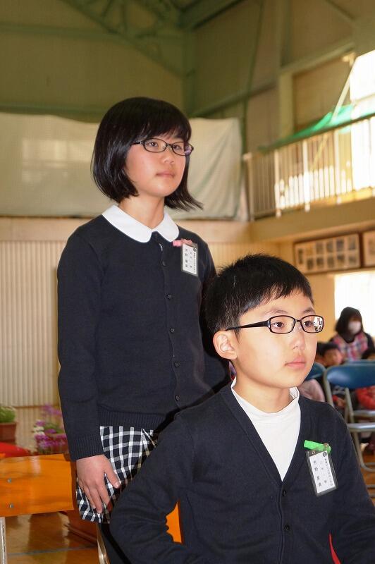 修了式後に本年度いっぱいで転出するNくんとHさんが、お別れのあいさつをしました。