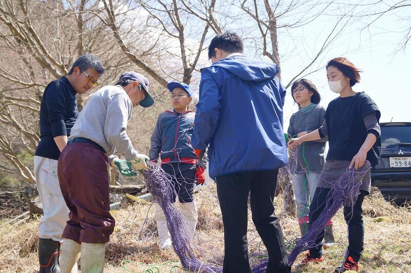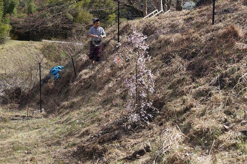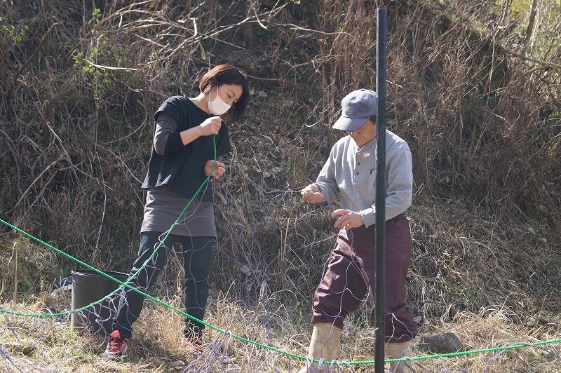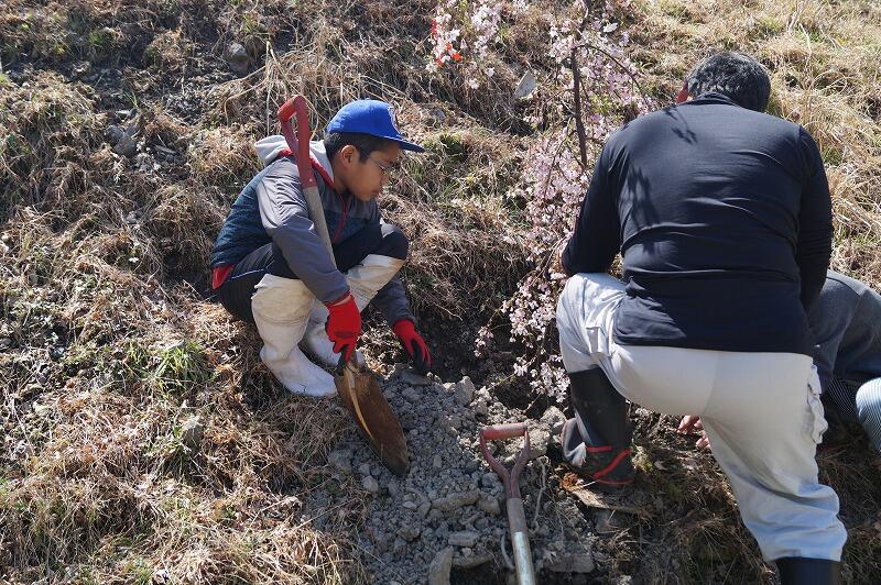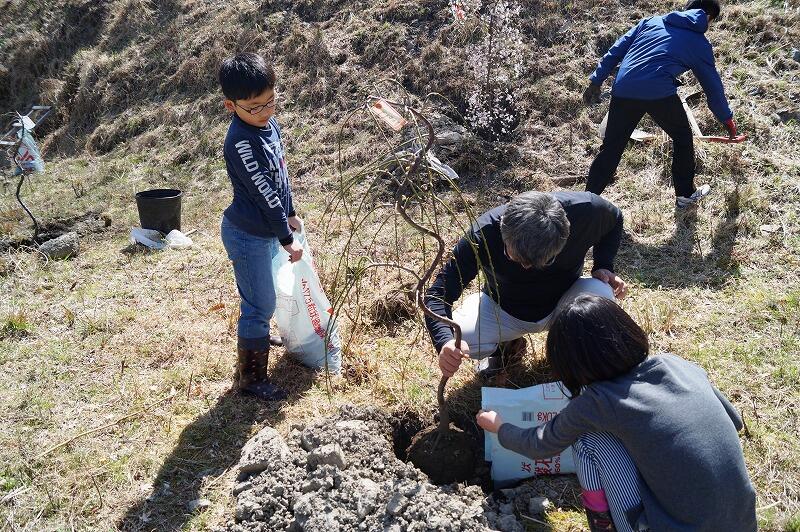 「梅・モモ・桜」の苗木を丁寧に植え、保護柵もしっかりと組むことができました。