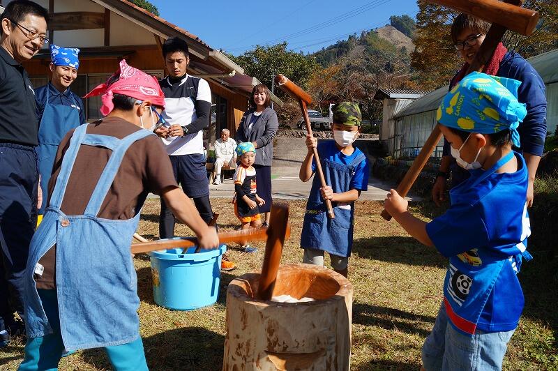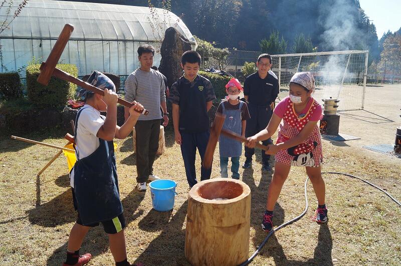 保護者や地域の方々の指導を受けながら、交代で杵を振り下ろして餅をつきました。