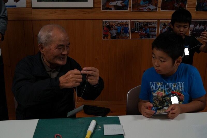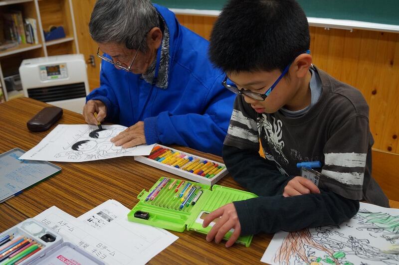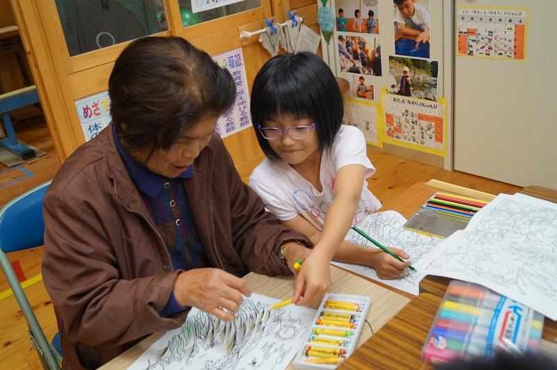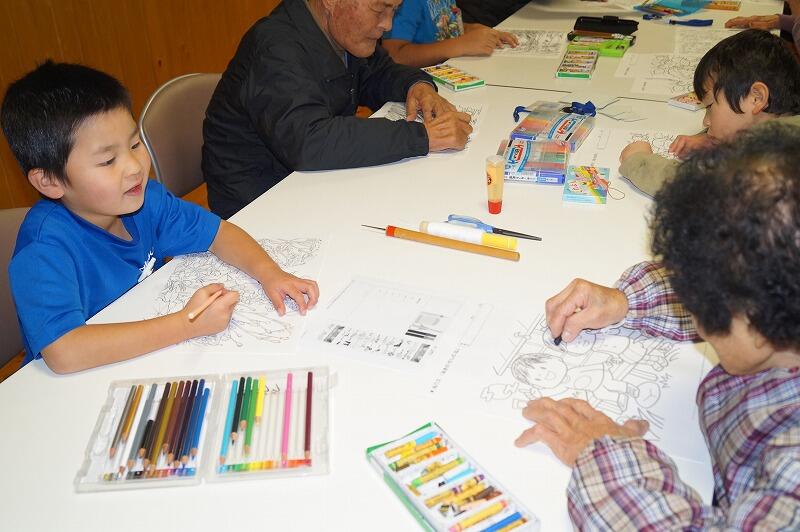 今回は、8名の「ふるさと先生」に協力をいただき、ぬり絵とブンブンごま作りをしました。