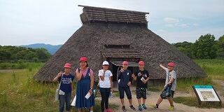 吉野ヶ里遺跡の竪穴式住居の前で。歴史の学習で勉強した