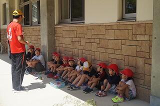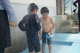 シャワーも冷たかったようです。先生も子どもに負けず、冷たそう。