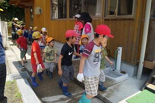 芋畑に移動です。小学生が保育園生の手を引いて移動です。