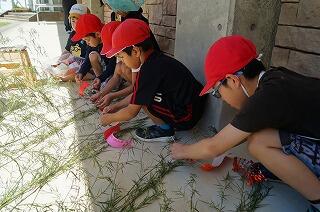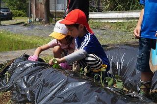 保育園生も上手に植えました。(おっ、何かあるぞ。えっ、どこどこ。)