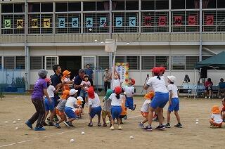 小学生と保育所生の子どもVS保護者の玉入れです。
