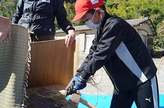 地域の方から、千歯扱き、唐箕をお借りして昔ながらの方法で