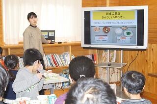 さっそく、養護教諭の先生が、給食時間に給食の歴史等について
