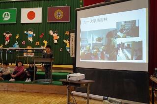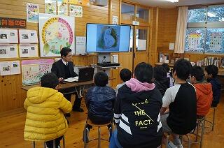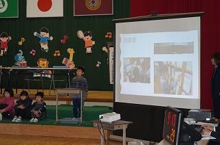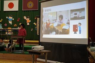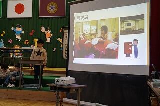 子どもたちが見やすいように挿絵をスクリーンに映しての