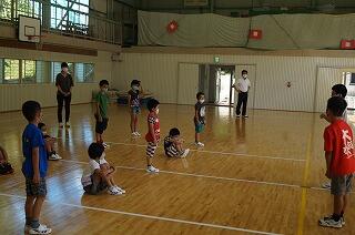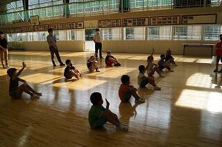 小学生団技。ペアでいろんなボールをいろんな道具で力を