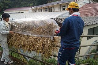 みんなで刈って、束ねた稲を掛け干ししていきます。