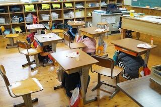 揺れがおさまったら、すばやく運動場へ避難です。